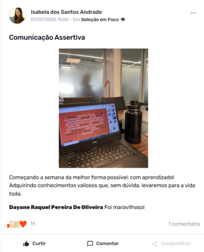 Mais do que capacitar, a trilha tem sido uma oportunidade de valorização e conexão entre operação e corporativo. Um exemplo disso é a Tayze Schuck, que se destacou ao longo do programa e será internalizada como parte do time matricial de Recrutamento e Seleção, reconhecida como um talento com alto potencial de contribuição.